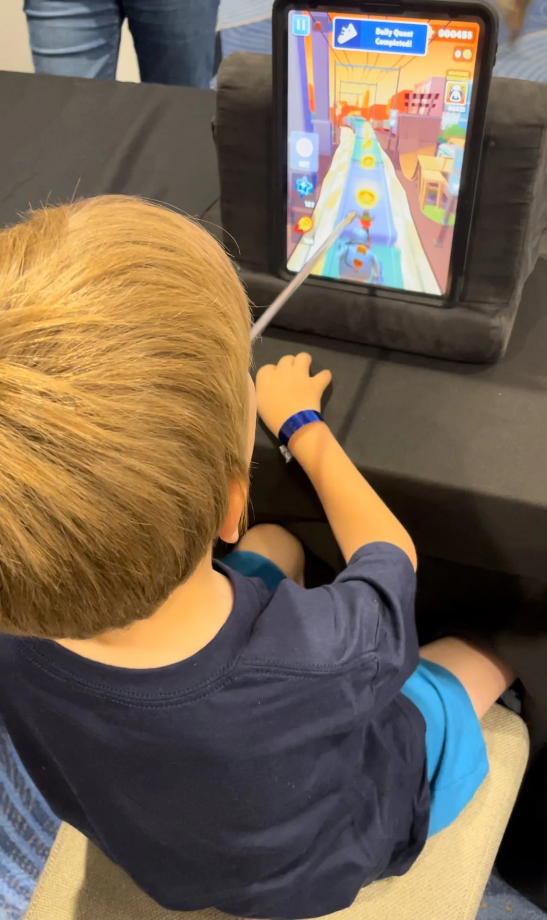 Image shows a child using the iReach Mouthstick Stylus to play a game on his tablet.